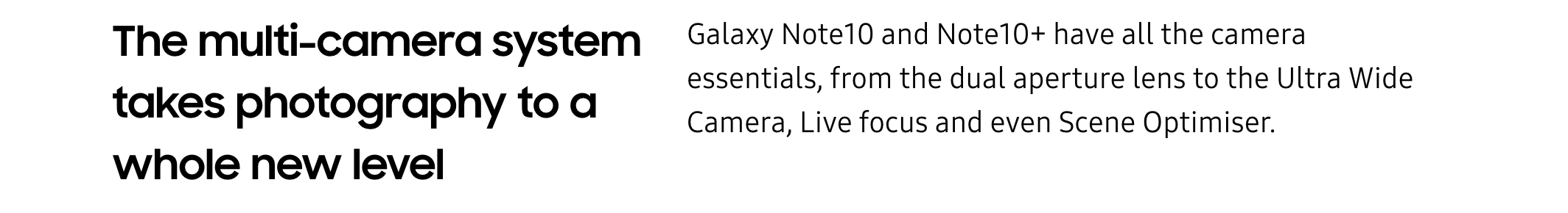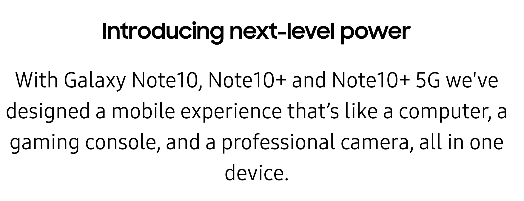 Introducing next-level power With Galaxy Note10, Note10+ and Note10+ 5G we've designed a mobile experience that’s like a computer, a gaming console, and a professional camera, all in one device.