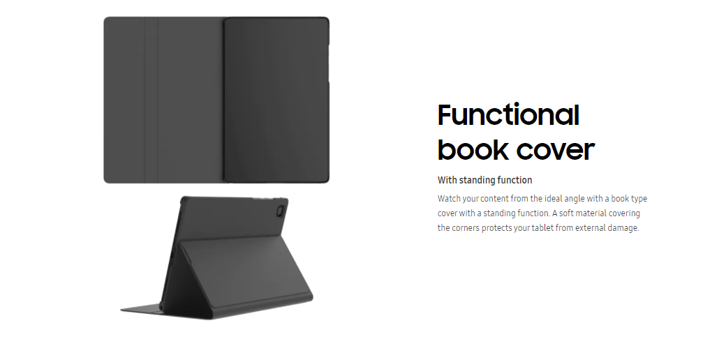 Watch your content from the ideal angle with a book type cover with a standing function. A soft material covering the corners protects your tablet from external damage.